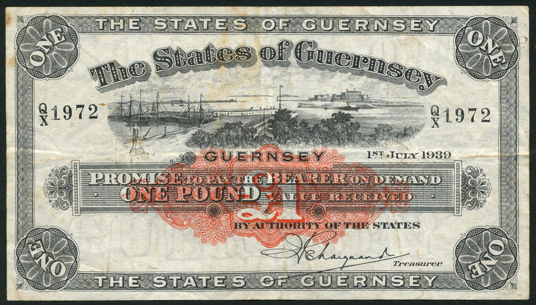 States of Guernsey, £1, 1 July 1939, serial number Q/X 1972, black on red underprint, view of harbour in St Peter port at centre, value at centre and corners, reverse blue, arms at centre