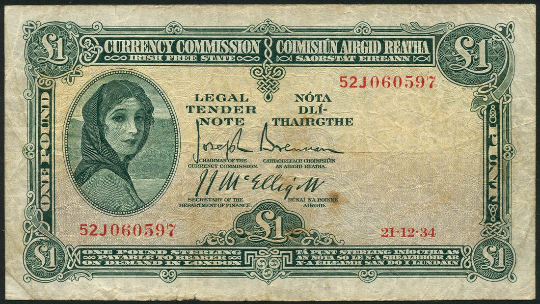 Currency Commission of Ireland, £1 (3), 1934, 1941, 1942, Central Bank of Ireland, £1 (5), 1958, 1963, 1971, 1976 (2), green on pale yellow and tan underprint, portrait Lady Lavery at left, bank title top centre, value in each corner and at low centre, reverse, River God