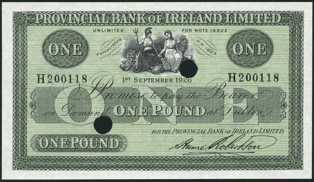 Provincial Bank of Ireland, remainder £1, 1 September 1926, serial number H200118, dark and light green, allegorical figures top centre flanked by value, bank title top centre, ornate border, Robertson signature, reverse, blue guilloche pattern