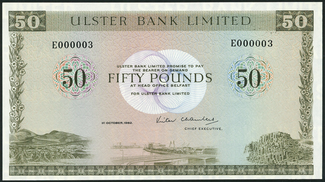 Ulster Bank Limited, £50, 1982, serial number E 000003, olive green, allegorical scenes in field, Chambers signature