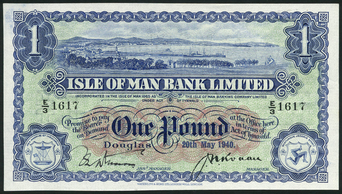 (x) Isle of Man Bank Limited. £1, 20 May 1940, serial number E/3 1617, signatures Ronan and Corteen, blue and brown on pale green underprint, vignette of Douglas Harbour at upper centre, value on either side, the old and new arms of the Lords of Man at lower left and lower right respectively, reverse triskeles at centre, value in ornate guilloches at left and right