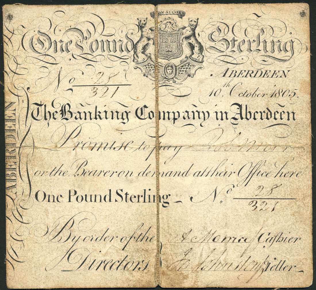 The Banking Company in Aberdeen, contemporary forgery £1, 10 October 1805, serial number 28/321, black and white, arms top centre with bank title below
