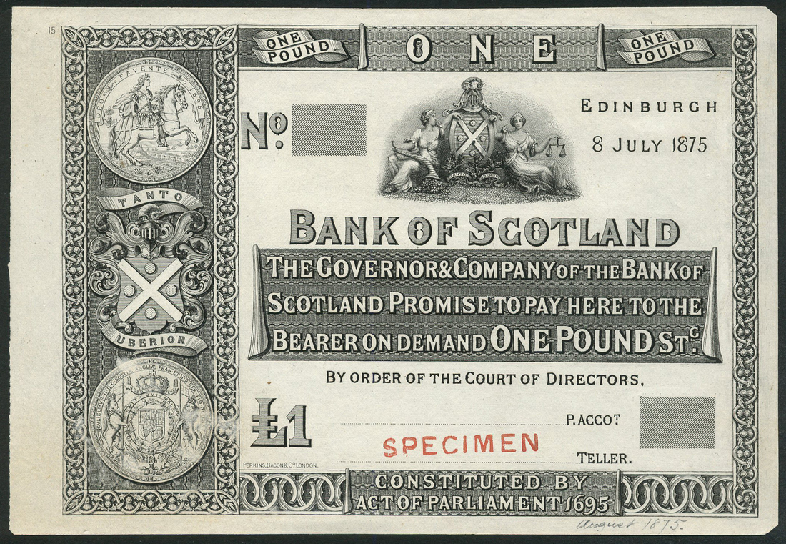Bank of Scotland, specimen £1, 8 July 1875, black and white, are top centre with bank title below, ornate vertical panel at left, value in margin along top, centre and low left, also, proof on card with a design for ONE