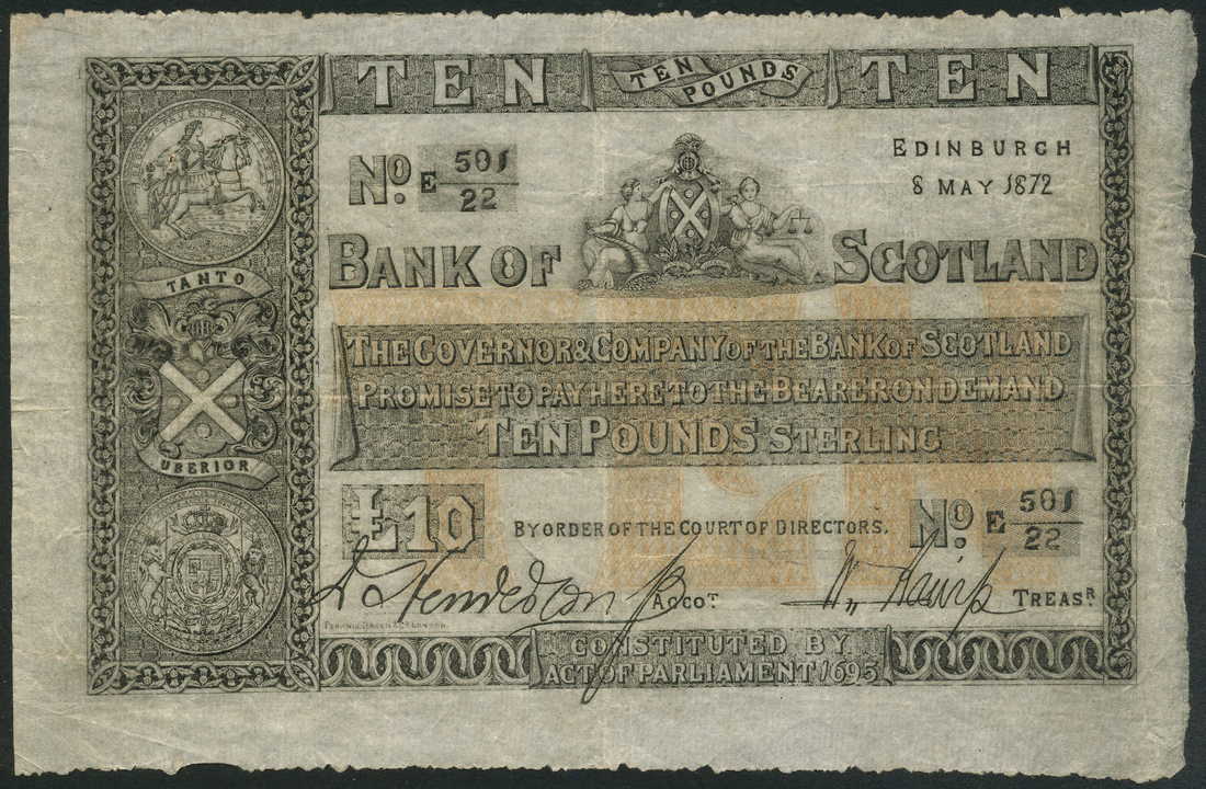 Bank of Scotland, a contemporary copy of a £10, 8 May 1872, serial number E 501/22 black and white and pale orange value at centre, arms top centre and arms in vertical panel at left