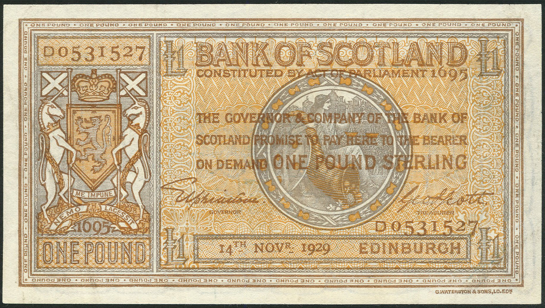 Bank of Scotland, a group of £1 as follows, 1929, 1932 (2), 1939, 1941, 1942, 1943, 1945 (3), 1950, 1952, 1955, 1959, 1961, 1964 (2), 1967 (2), brown on light orange and grey underprint, arms in vertical panel at left, bank title top centre with medallion below