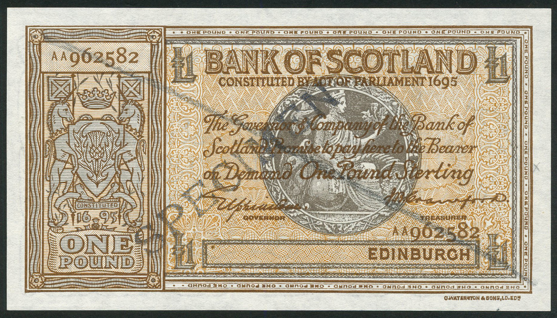 Bank of Scotland, trial £1, ND (1942), serial number AA 962582, orange-brown, arms and unicorns at left in grey, Scotia in circular grey panel right centre, Elphinstone and Crawford signatures, reverse the Bank Head Office at centre, arms at left and right