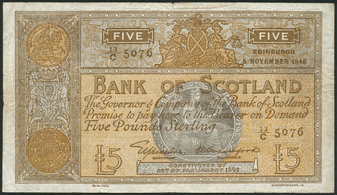 Bank of Scotland, £5 (7), 1946, serial number 13/C 5076, 1950, serial number 12/G 8300, 1952, serial number 11/K 0651, 1956, serial number 14/J 5138, 1959, serial number 5/BA 1795, 1961, serial number 2/A 5599, 1966, serial number F 351426