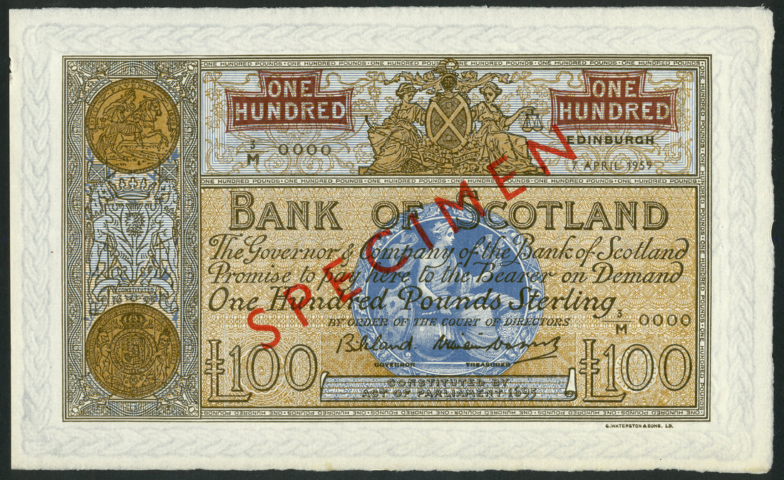 Bank of Scotland, specimen £100, 7 April 1959, serial number 3/M 0000, uniface, orange-brown, arms and unicorns at left in grey and pale blue, Great Seal of Scotland top centre, Scotia in circular blue panel at centre, Bilsland and Watson signatures