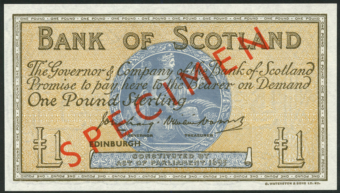 Bank of Scotland, £1, no date, no serial number, light orange-brown, Scotia in circular blue panel at centre, Bilsland and Watson signatures, value low left and right, reverse brown, ship at centre flanked by thistles, value low left and right