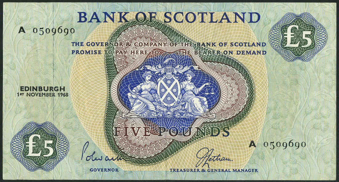 Bank of Scotland, £5, 1968, green and blue, £5 (6), 1990, 1991, 1993 (3), 1994, blue, Sir Walter Scott at right, including two ZB prefixes, also specimen £5, 4 January 1995, serial number AA 000000, blue, Sir Walter Scott at left, Patullo and Burt signatures, also £5 (5), 1995 (2), 1996 (2) and 1998, 2006, one 1995 ZZ prefix and £5 (2), 207, blue