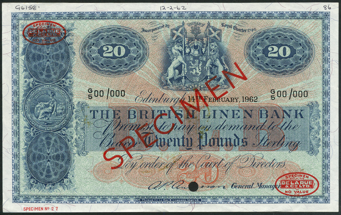 British Linen Bank, specimen £20, 14 February 1962, serial number G/5 00/000, blue, red sunburst pattern at centre, arms flanked by value top centre, printed signature of A.P.Anderson low centre, reverse blue, Britannia at centre, also, an issued £20, 1954, serial number X4 06/326