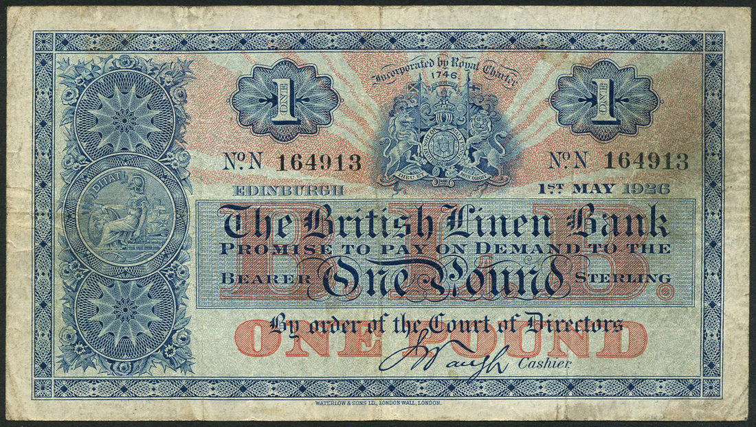 British Linen Bank, £1, 1926, serial number N 164913, 1927, serial number O 599942, 1934, serial number G 194272, 1935, serial number I 160180, 1935, serial number O 098119, 1937, serial number Q 002421, 1938, serial number Z 063882, 1939, serial number A 032361, 1940, serial number E/1 141167, 1944, serial number R/1 091255, 1947, F/2 020287, 1950, serial number R/2 714534, 1950, serial number R/2 293796, 1958, serial number I/3 120822, 1960, serial number N/3 744370, 1961, serial number R/3 611875, 1967, serial number P/4 000848, 1967, serial number Q/4 642562, 1967, serial number T/4 069124, 1968, serial number V/4 373582, 1969, serial number Z/4 453636, 1970, serial number D/5 433968, 1970 (2), consecutive serial numbers D/5 062009/10 (last date for type)