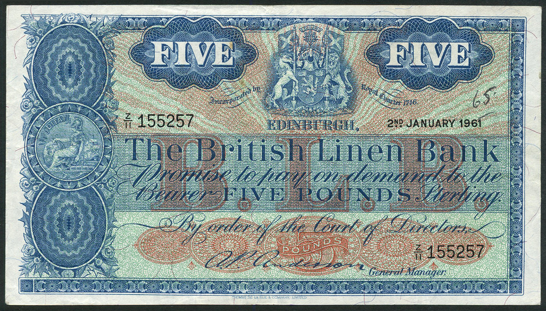 British Linen Bank £5, 1947, serial number Z7 6/108, 1947, serial numberA8 16/57, 1951, L9 31/435, 1957, N11 052913, 1959, serial numberW11 110882, 1961, serial number Z/11 155257 (penultimate date for type), 1962, serial number E/12 353725, 1964 (3), serial numbers G/12 081821, H/12 459329, I/12 413712, 1968, serial number K/12 897443 (penultimate date for type)