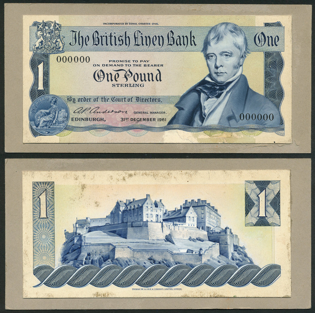 British Linen Bank, a printer's archival composite obverse and reverse essay on board for a proposed issue of £1, 3 December 1961, blue on multicolour underprint, portrait Sir Walter Scott at right, arms top left and DITAT emblem low left, reverse, illustration of Edinburgh Castle