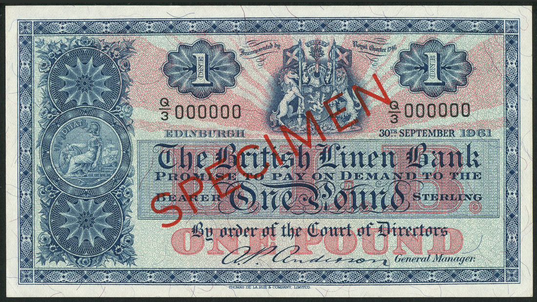 British Linen Bank, a group of specimens as follows, £1 (5), 1961, serial number Q/3 000000, 1962 (2), first, serial number U/3 000000, second, no serial number, 1967, serial number P/4 000000, 1968, serial number U/4 000000, £5, 1962, serial number D/12 000000, blue on red and yellow sunburst underprint, two feature portrait Sir Walter Scott