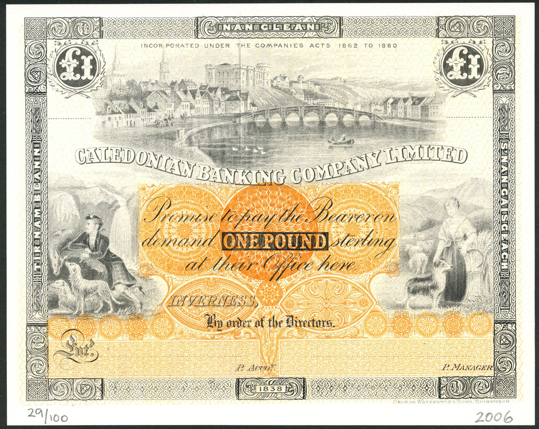 Caledonian Banking Company, limited edition museum experimental proof £1 on thin card, 1891, Waterston printing - 1890, black white and orange, view of Inverness along top flanked by value in black circular panels, shepherd an shepherdess at left and right respectively,
