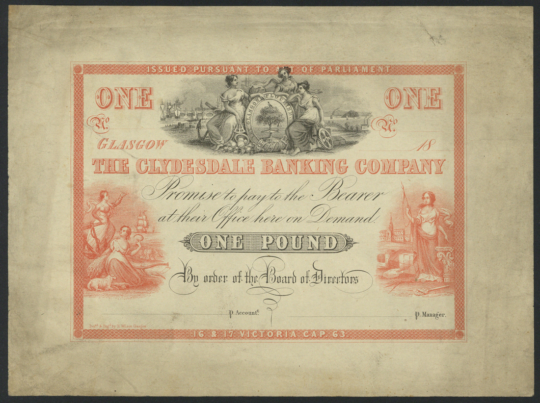 Clydesdale Banking Company, proof £1 on large format paper, 18- (c. 1865), red and white, maidens and arms top centre, maidens at left and right