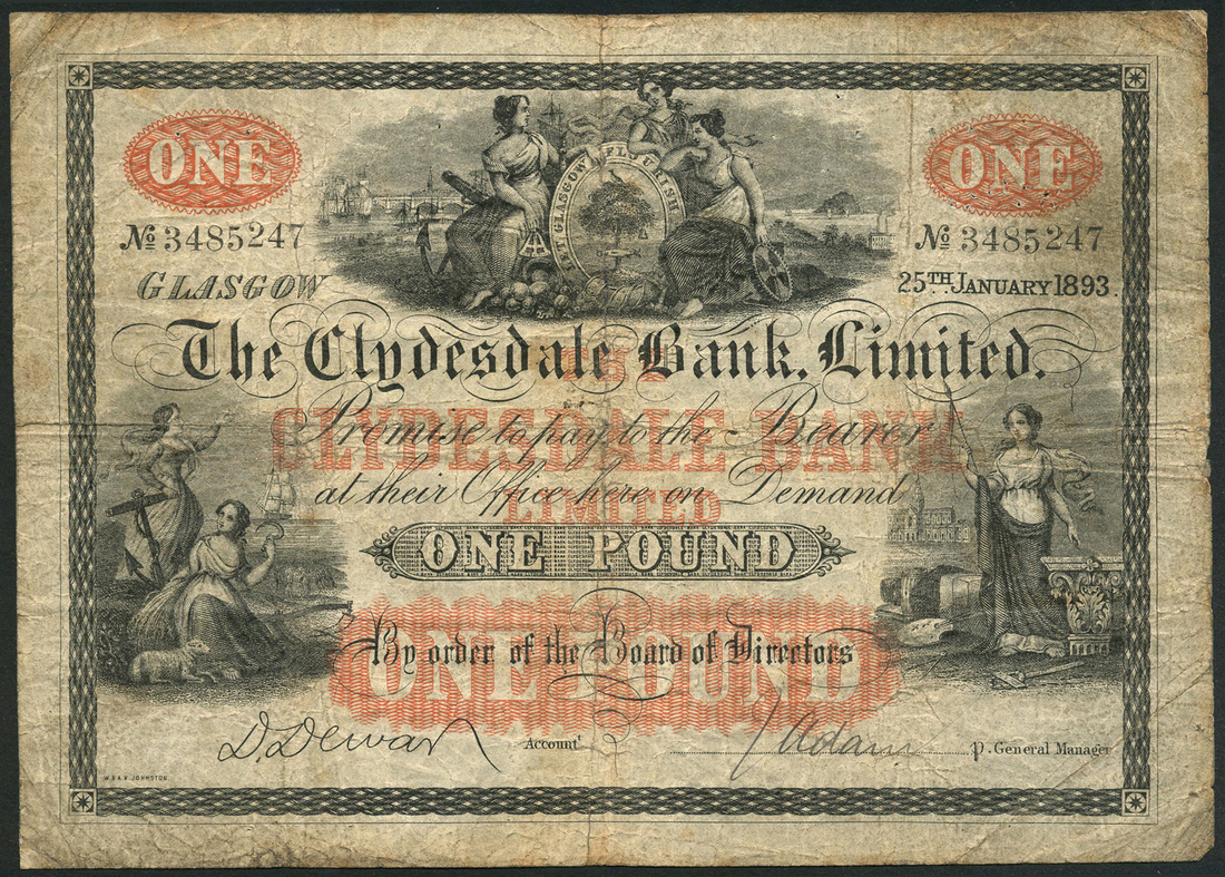 Clydesdale Bank Limited, £1, 25 January 1893, serial number 3485247, black and white, value and bank title in red underprint, maidens and arms top centre, maidens at left and right with allegorical symbols of trade and industry, printed signature of Dewar low left, manuscript signature low right