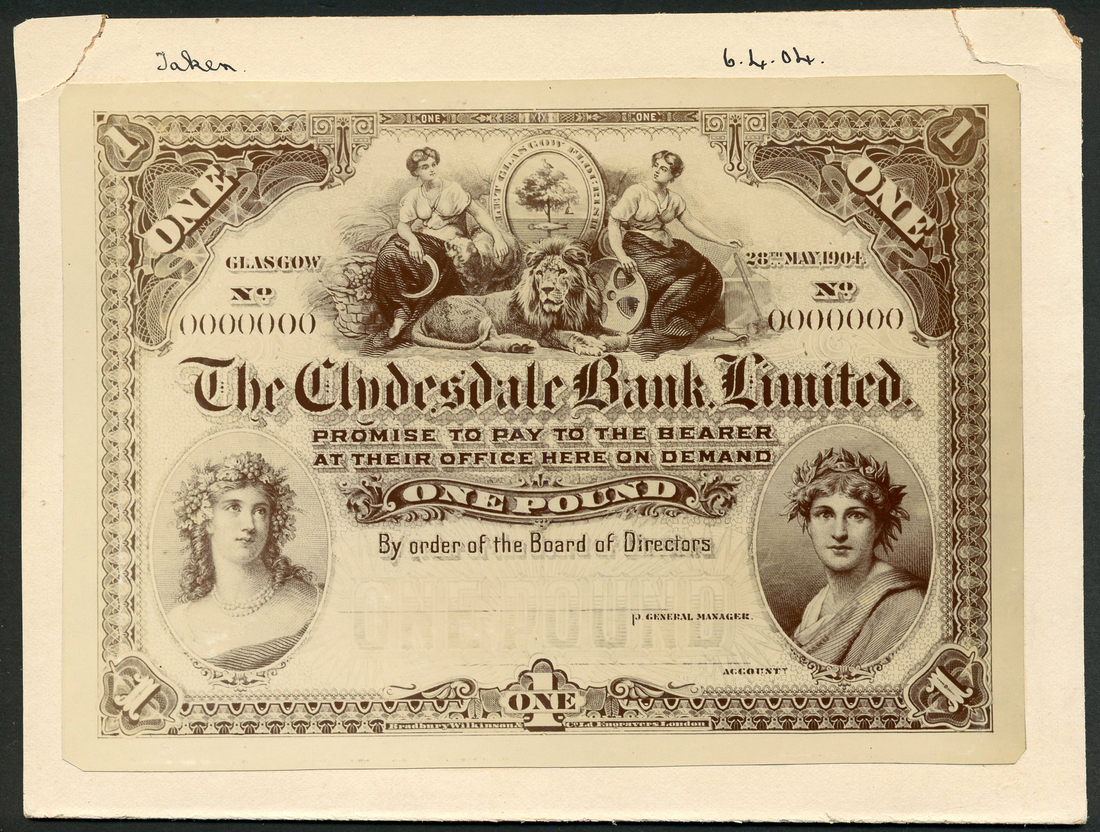 Clydesdale Bank Limited, archival photograph of an unadopted obverse design for £1, 28 May 1904, together with a Royal Bank of Scotland proposed design for £1, 1905