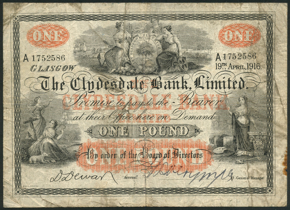 Clydesdale Bank Limited, £1 (2), 8 October 1913, serial number A0327667, 19 April 1916, serial number A1752586, black and white, value and bank title in red underprint, maidens and arms top centre, maidens at left and right with allegorical symbols of trade and industry, printed signature of Dewar low left, manuscript signature low right