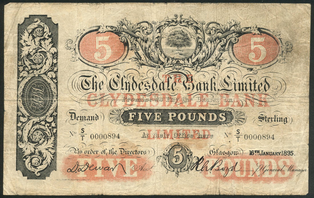Clydesdale Bank Limited, £5, 16 January 1895, serial number S/T 0000894, black and white, bank title and value in pale red underprint, arms at top centre, bank initials left centre, printed signature of Dewar low left, manuscript signature of Boyd low right