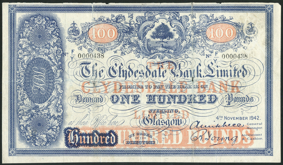 Clydesdale Bank Limited, £100, 4 November 1942, serial number F/Y 0000438 blue and white, value and Bank title in pale red at centre and top left and right, arms top centre, Bank initials at left, printed signatures of Mitchell and Young at low right