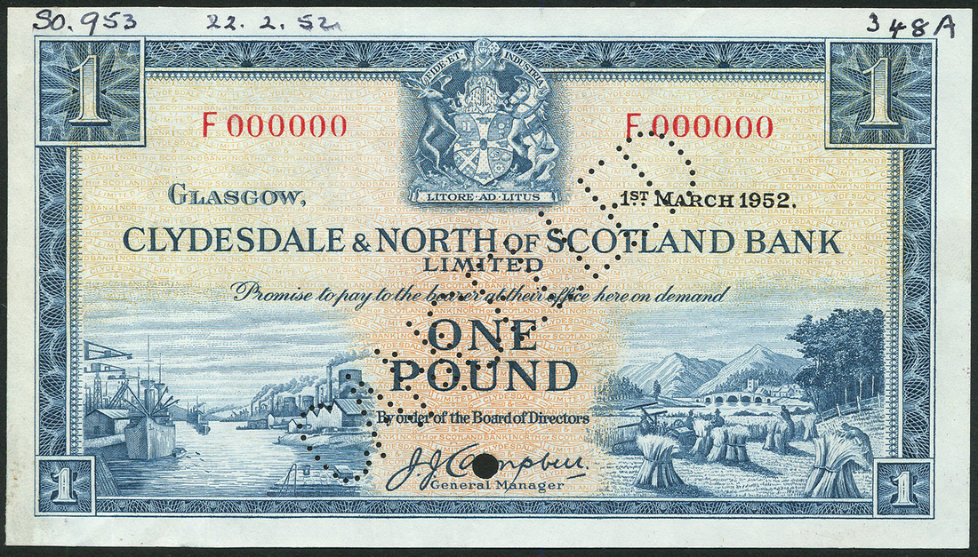 Clydesdale and North of Scotland Bank Limited, specimen £1, 1 March 1952, serial number F 000000, blue, pale yellow and red, allegorical scenes low left and right, also £1 (3), 1954, 1956, 1960 and £1 (2), 1961, green, £5 (5), 1951, 1955, 1956, 1960 (2), purple and £5 (2), 1961 and 1963, blue and