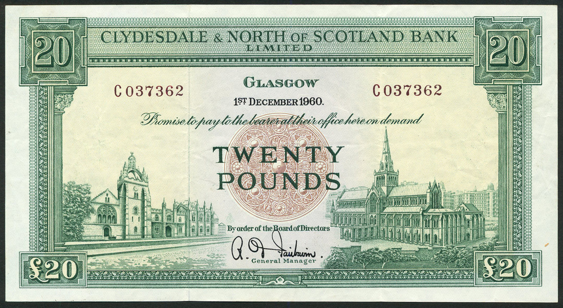 Clydesdale and North of Scotland Bank Limited, £1, 1958, serial number A/R 000025, blue on light yellow and orange underprint, arms top centre, value in each corner and at centre, industry on the River Clyde low left, rural scene low right, £5, 1960, serial number A/Z 001074, £10, 1960, serial number C037362, purple and green respectively, both bank title top centre, illustration of King's College, Aberdeen at left and Glasgow Cathedral at right