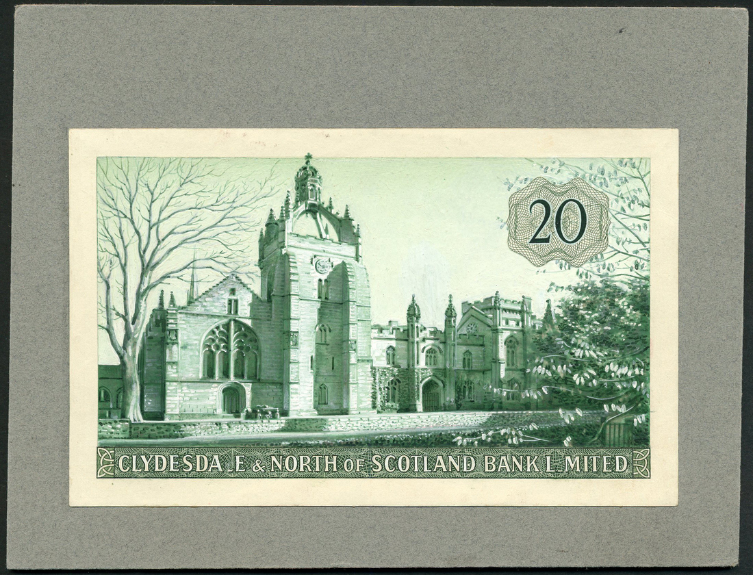 Clydesdale & North of Scotland Bank Limited, composite essay on card for a reverse £20, ND, green, Kings College, Aberdeen, bank title low centre, value top right