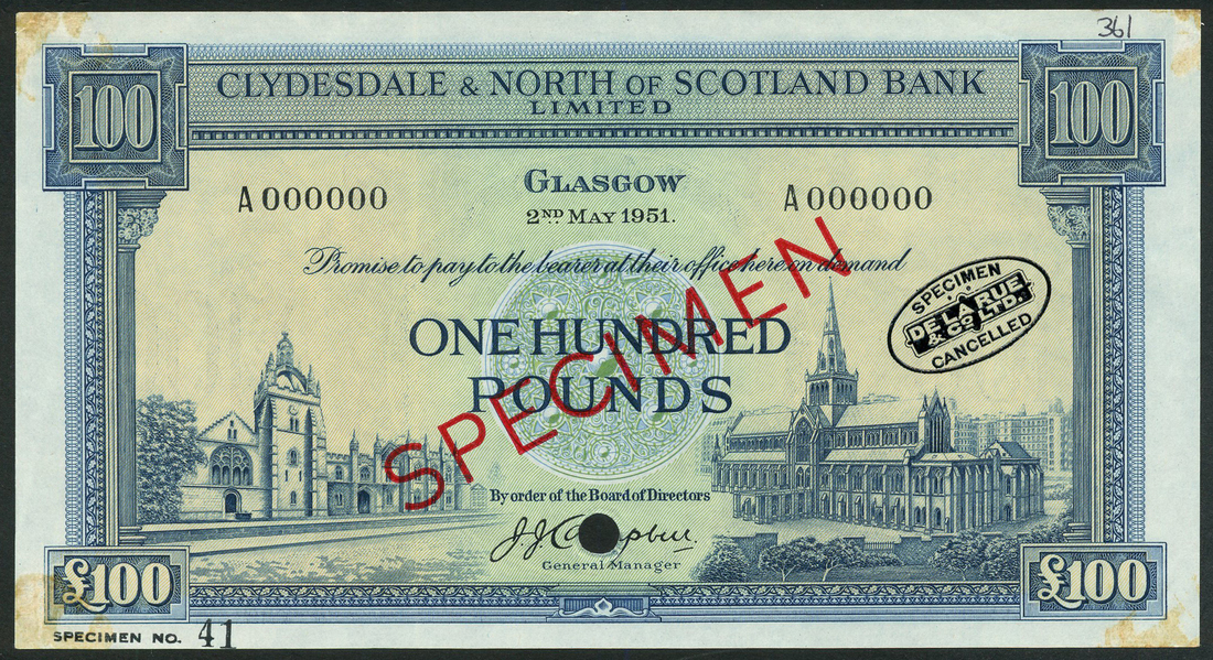 Clydesdale and North of Scotland Bank Limited, Clydesdale and North of Scotland Bank Limited, blue on light green underprint, illustration of Kings College at left and Glasgow Cathedral at right, bank title top centre, value in each corner and at centre, reverse, ornate blue panel with arms at centre flanked by value