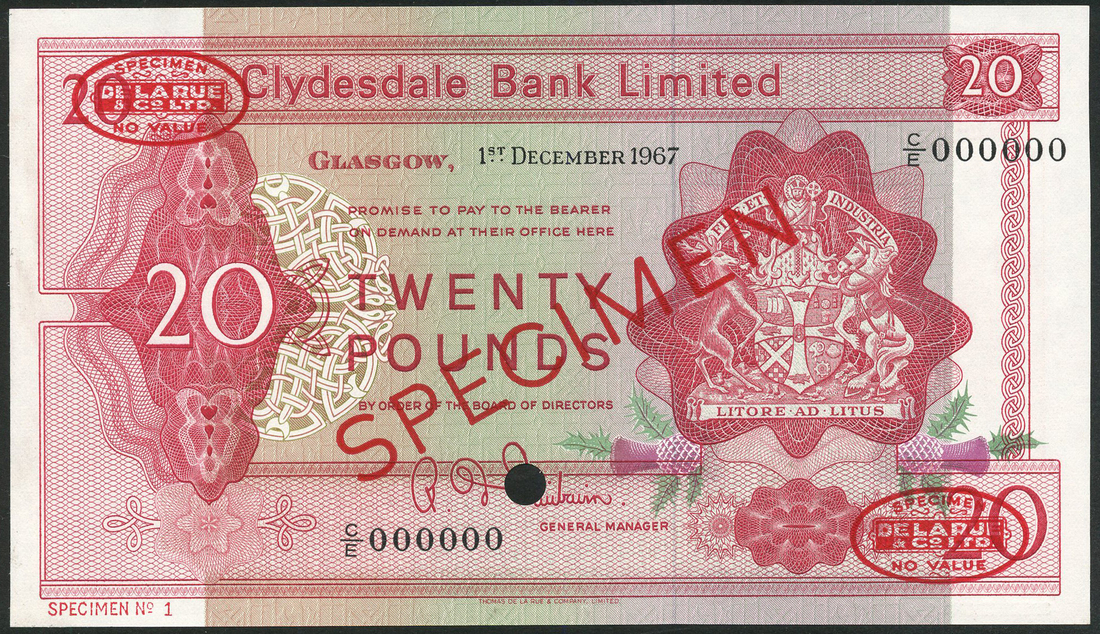 Clydesdale Bank Limited, specimen £20, 1 December 1967, serial number C/E 000000, red on multicolour underprint, arms at right, value at left, single cancellation hole, red SPECIMEN overprint and De LA Rue ovals
