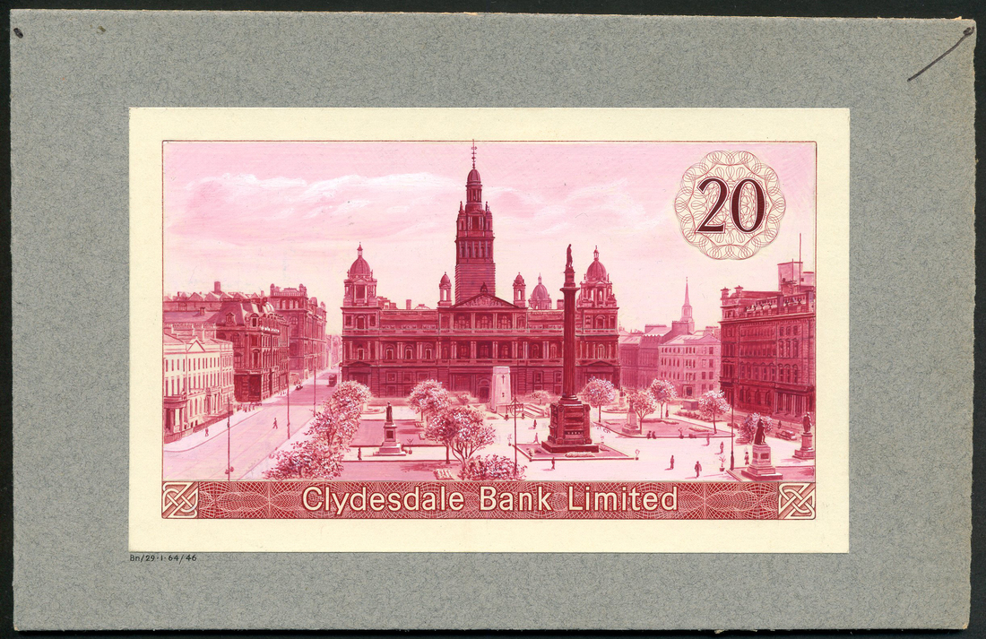 Clydesdale Bank Limited, hand executed reverse essay for £20, ND (1964-67), dark red on pink, view of St George's Square in Glasgow, bank title low centre, value top right