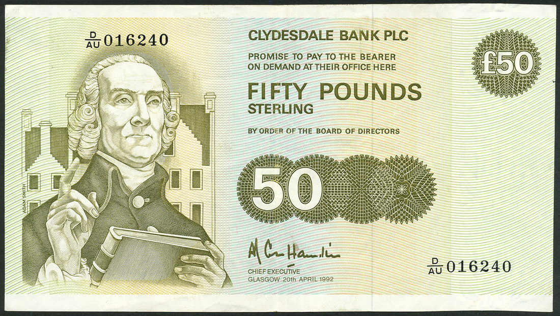 Clydesdale Bank Limited, Clydesdale Bank plc, specimen £1, 2 September 1963, serial number C/A 000000, green, arms at right, Fairbairn signature, also £1 (4), 1966, 1967, 1968, 1969, £1 (6), 1971, 1974, 1975, 1985 (2), 1988, two replacements included, D/Z and D/ZZ, also £20, 2005 and £50, 1992, green, Adam Smith at left