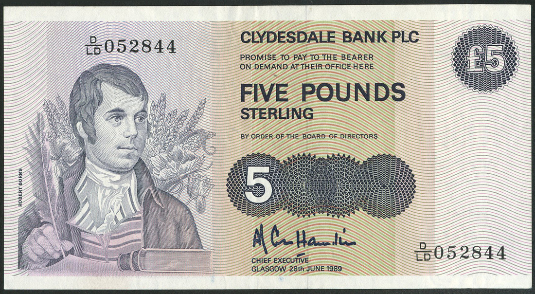 Clydesdale Bank, first polymer issue, limited edition of 2015 (3), serial numbers FB/1 000200, FB/1 000250, FB/1 326823 and ZZ/1 017954, together with general issue of 2016, serial number W/HS 000187, as well as, a group of £5 (8), 1963, serial number C/D 163852, 1987, serial number D/JK 139049, 1989, serial number D/LD 052844, 1990, serial number E/AY 068600, 1990, serial number E/AA 003042, 1994, serial number E/DL 076209, 1996, serial number R/B 0001102, 2002, serial number E/DZ 117842, 2009 (2), consecutive serial numbers W/HS 012148/9, together with a piece of paper bearing the watermark of Sir Alexander Fleming (as shown on the 2009 issue)
