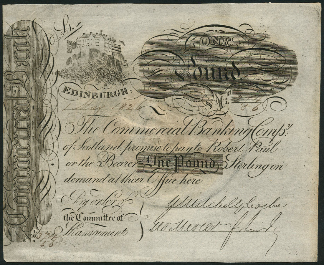 Commercial Banking Company of Scotland, £1 (2), 1 May 1926 and 2 June 1926, serial numbers 374/56 and 5/792, uniface, black and white, vignette of Edinburgh Castle top centre left, 'payable to Robert Paul or bearer' at centre