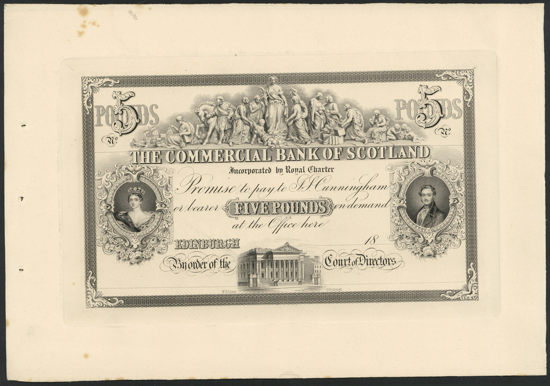 Commercial Bank of Scotland, large format proof £5, 18- (1850), black and white, portrait Queen Victoria and Prince Consort in ornate frames at left and right respectively, value top left and right and in tablet at centre, bank building low centre, together with large format proposed design, allegorical figures at left and right, arms top centre flanked by unicorns, bank building and ship in background, both Lizars engraving