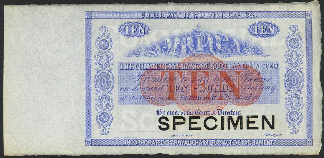 Commercial Bank of Scotland Limited, specimen £10, 3 April 18-(1882), blue and white, classical frieze of allegorical figures top centre, value in red engine turned concentric circles at centre, value in blue oval top left and right, ornate panel at left and right, Perkins Bacon engraving
