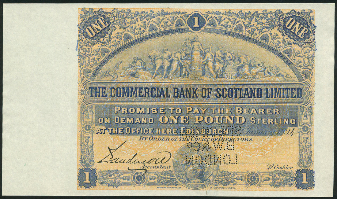 Commercial Bank of Scotland Limited, specimen £1, 2 January 1894, no serial number, blue on buff underprint, figures sculptured on the pediment of the bank's head office building at upper centre, reverse green, head office building set in ornate patterned oval, printed signature of accountant, reverse green, Head Office building set in ornate frame