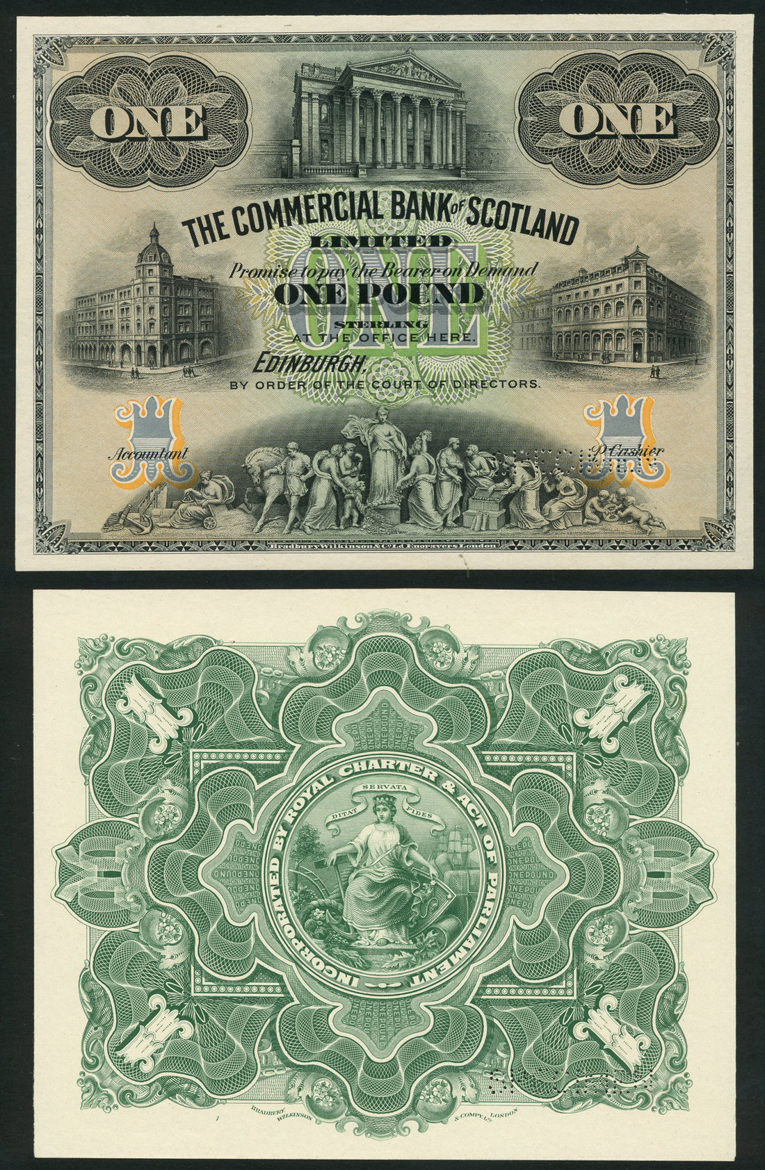 Commercial Bank of Scotland Limited, specimen/colour trial obverse and reverse £1, ND (1907), black on buff, illustrations of bank offices in Glasgow and London, value in ornate ovals top left and right, value in green at centre and in grey and orange low left and right, classical frieze low centre, Bradbury Wilkinson engraving, reverse, green panel with bank arms at centre
