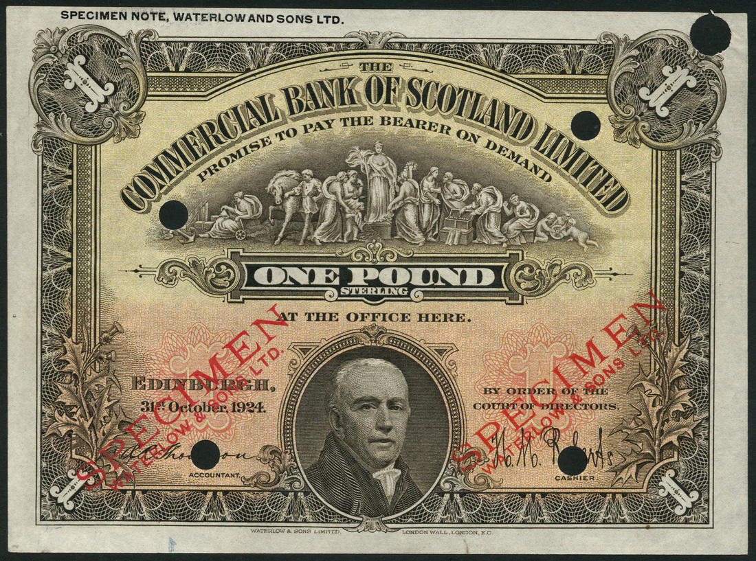 Commercial Bank of Scotland limited, colour trial £1, Edinburgh, 31 October 1924, brown, pale orange and red, classical frieze top centre, John Pitcairn low centre, value at centre, in red low left and right and at each corner, Thomson and Roberts signatures low left and right, reverse brown, bank building at centre, value at left and right
