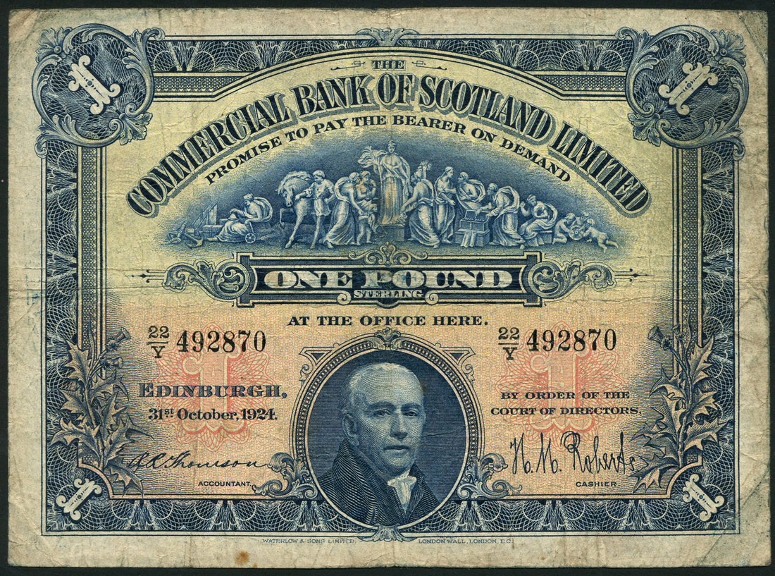 Commercial Bank of Scotland Limited, £1 (11), 1924 (2), 1928, 1929, 1934, 1935, 1939, 1940 (2), 1941 (2) blue on light red and yellow underprint, portrait Lord Pitcairn low centre, bank title top centre with classical frieze below, value in each corner and at centre, reverse, blue