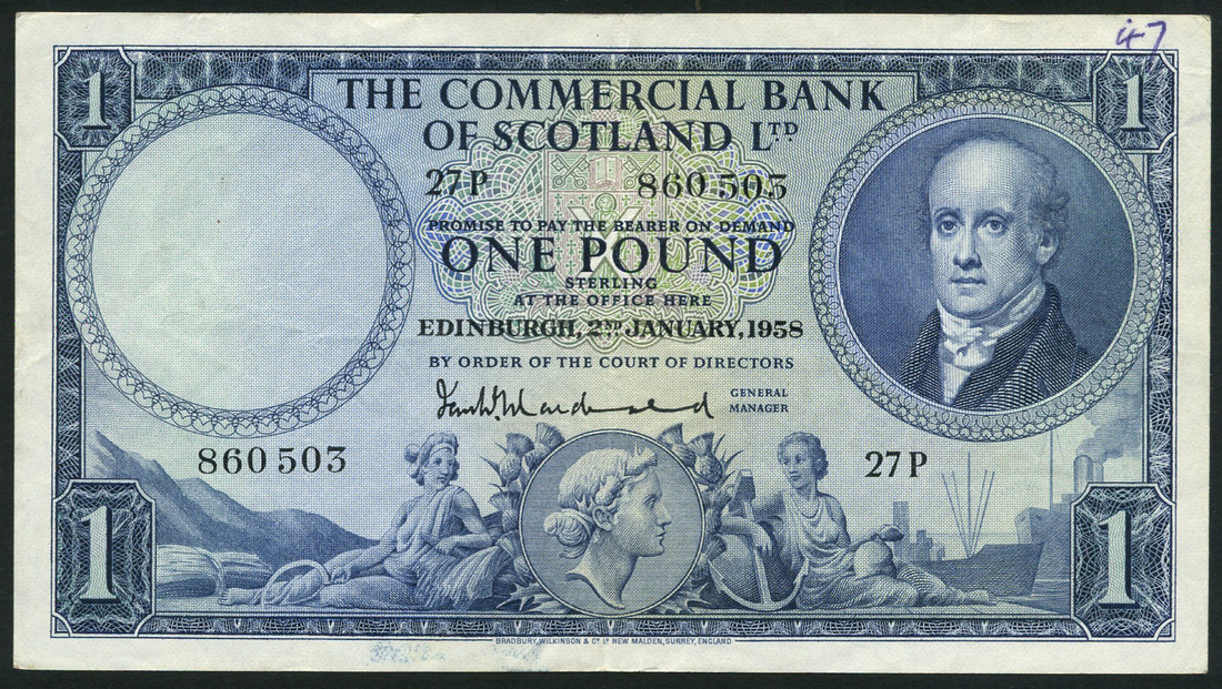 Commercial Bank of Scotland Limited, £1 (8), 1947, 1949, 1952, 1954 (specimen), 1955, 1956, 1957, 1958, first three, purple, remainder, blue, all feature portrait Lord Cockburn at right, bank title top centre, reverse, bank arms