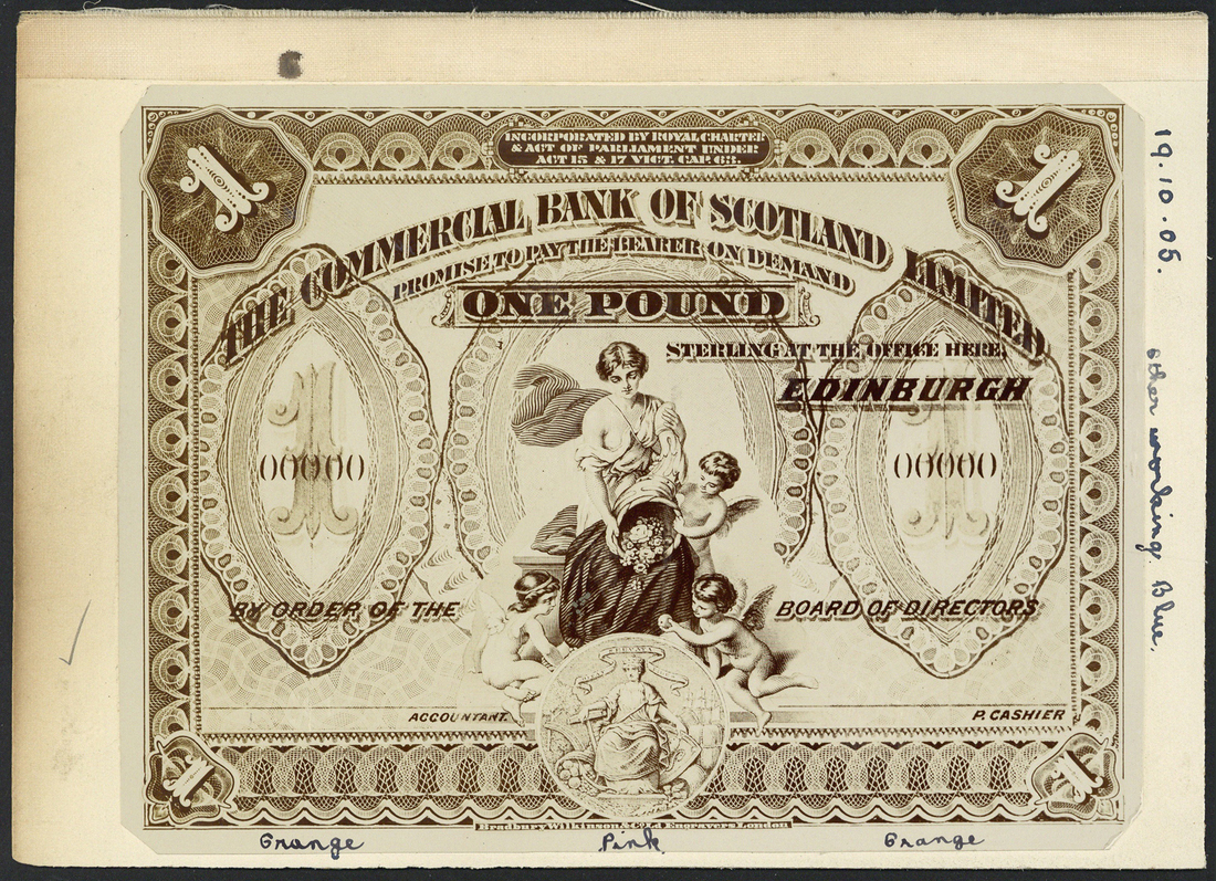 Commercial Bank of Scotland, a selection of archival photographs comprising, unadopted design for £1, ink date 1905, obverse partial design £1, 1907, obverse £1, 1907, top border differs from issued note, unadopted design obverse and reverse for £1, 1924, unadopted design obverse for £1, 1924, unadopted design reverse for £1, pencil date 1923, two proposed obverse designs for £1, slightly different portraits of Lord Pitcairn, together with a proposed design reverse £1, obverse and reverse £5, pencil date 1907, unadopted design obverse for £100, 1924 (proposed design for £1 dated 1924 on reverse), obverse £100, pencil date 1907, unadopted design obverse and reverse (2) for £1, 1938, unadopted design obverse and reverse for £1, 1938, unadopted design obverse and reverse for £1, 1937, unadopted design obverse and reverse for £1, 1937, a group of vignettes