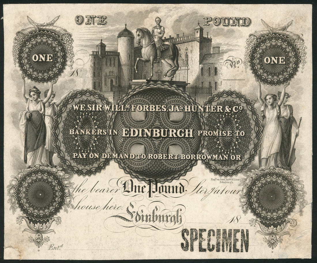Sir William Forbes, James Hunter & Co., proof £1 on card, 18- (c.1838), black and white, equestrian statue top centre in Parliament Close, value in ornate circular frame top left and right, allegorical maidens at left and right, 'pay on demand to Robert Borrowman or' in text at centre