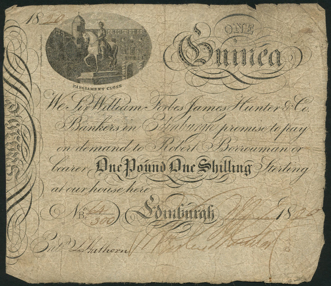 Sir William Forbes, James Hunter & Co., 1 guinea, Edinburgh, January 1820, serial number B 64/300, black and white, equestrian statue top left, value top centre right and at low centre, two manuscript signatures below, also, a £1 forgery dated 1 October 1822, serial number 25/6411, black and white, equestrian statue top centre, red and black Congreve stamp on reverse, together with a piece of watermarked paper