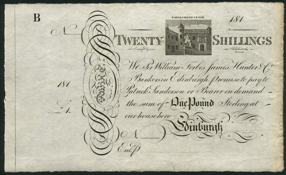 Sir William Forbes, James Hunter & Co, unissued One pound, ND (ca 1820), black and white, equestrian statue in Parliament Square top centre, 'pay to Robert Borrowman or bearer' in text at centre, counterfoil at left