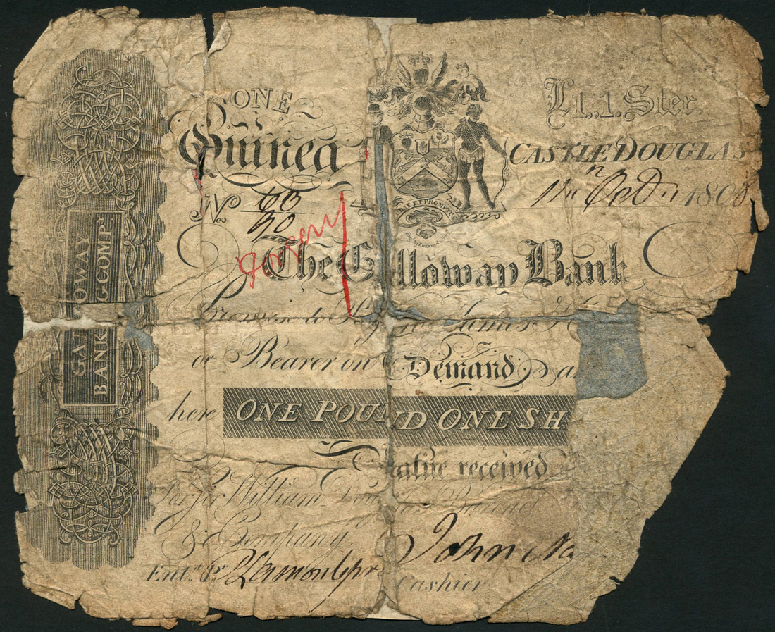 Galloway Banking Company, £1 one shilling, Castle Douglas, 11 October 1808, serial number 63/90, black and white, arms top centre, 'pay to James Hannay or Bearer' in text at centre, for Sir William Douglas, John Napier & Company, two signatures below