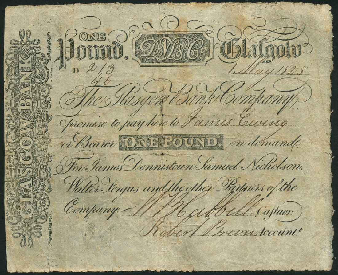 Glasgow Bank Company, James Dennistoun, Samuel Nicholson, Walter Fergus and the other partners, £1, 1 May 1825, serial number 213/46, black and white, partnership initials in ornamental script top centre, 'pay to James Ewing or the bearer' in text, two manuscript signatures low centre right, bank title in border at left, reverse, black and red revenue stamp, Haldane engraving