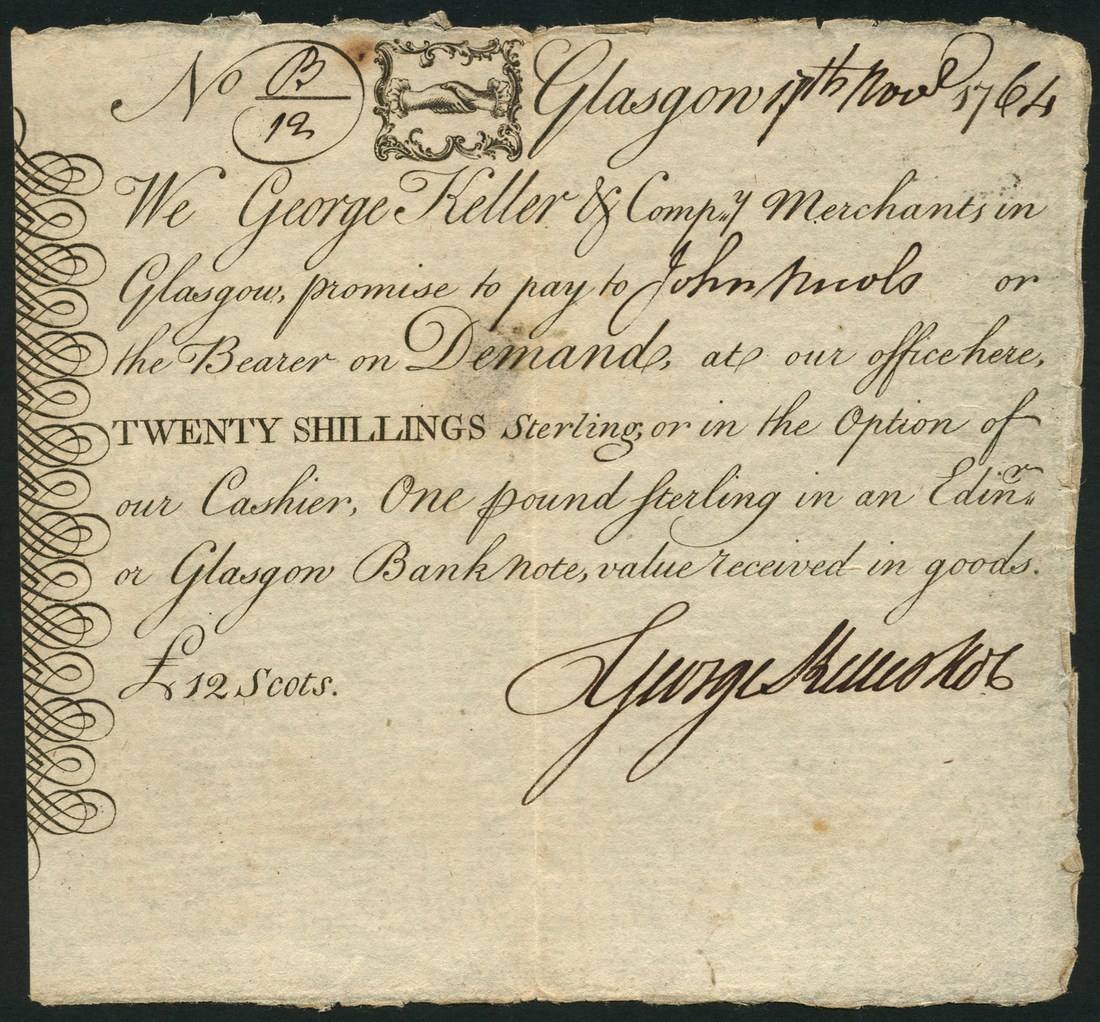 George Keller & Company, Glasgow, 20 shillings, manuscript date 7 November 1764, serial number B/12, black text on white paper, clasped hands top centre, manuscript signature of George Keller low right