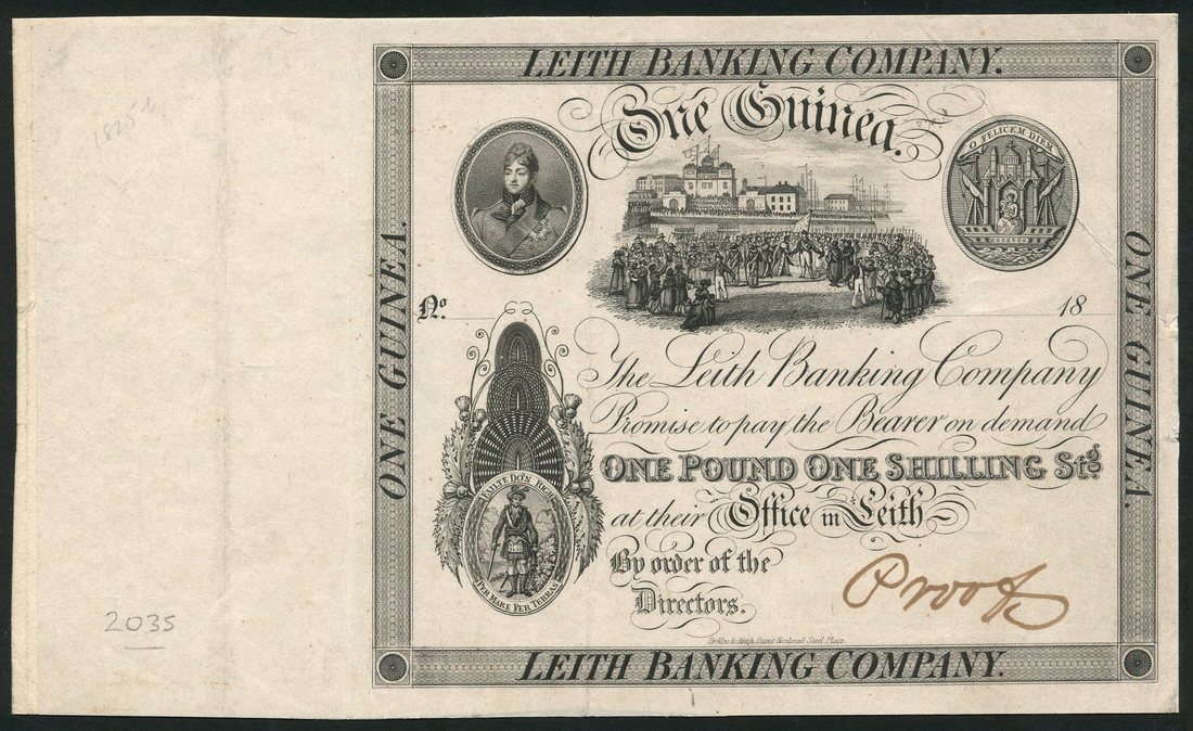 Leith Banking Company, proof one guinea, 18--, uniface, black and white, depiction of King George IV at Leith flanked by portrait of the King and Arms of Leith in circular frames, bank title and value within border, Perkins & Heath engraving